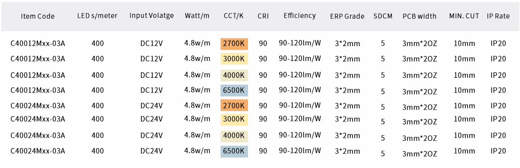 1. 400LED/M:400 COB(板上芯片)LED芯片每米集成。光线连续无颗粒,达到均匀无斑点的效果,适用于高需求的照明场景。