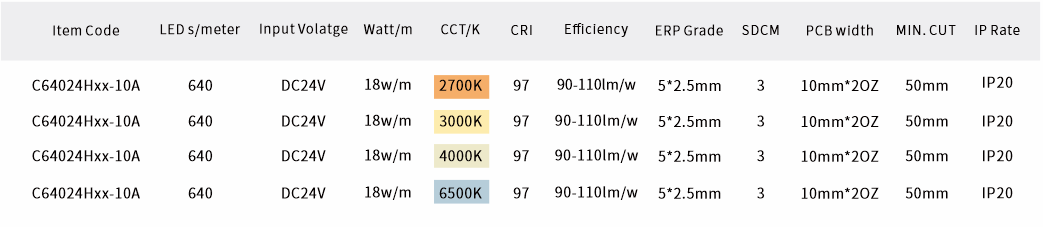 2. 高密度COB(板上芯片)集成技术,每米640个LED。发光均匀,没有颗粒感,光线柔和,没有频闪效应,避免了传统灯条的“点状光点”问题。