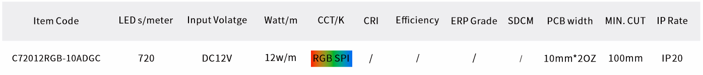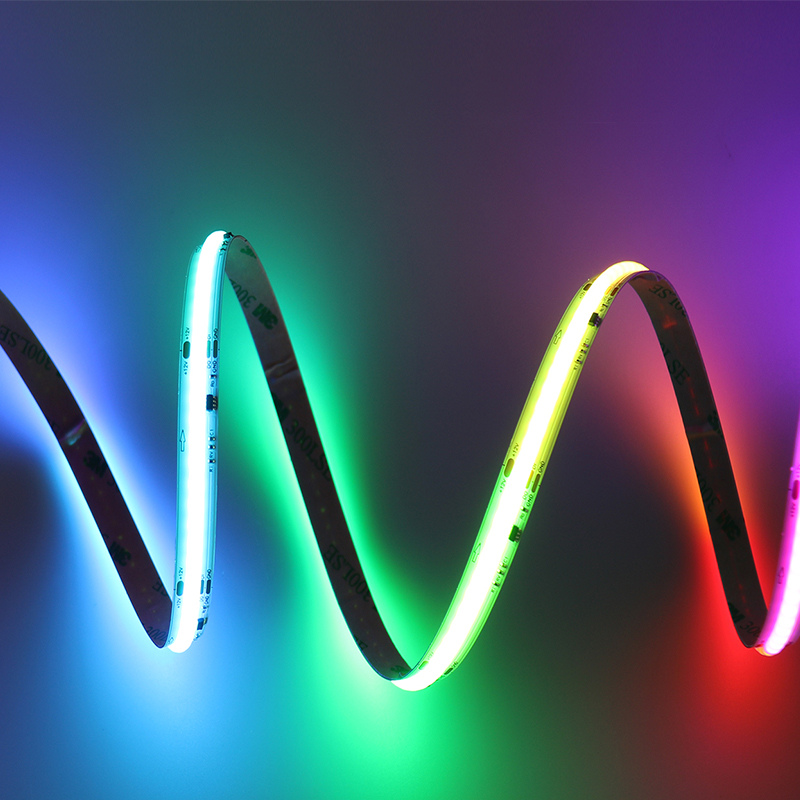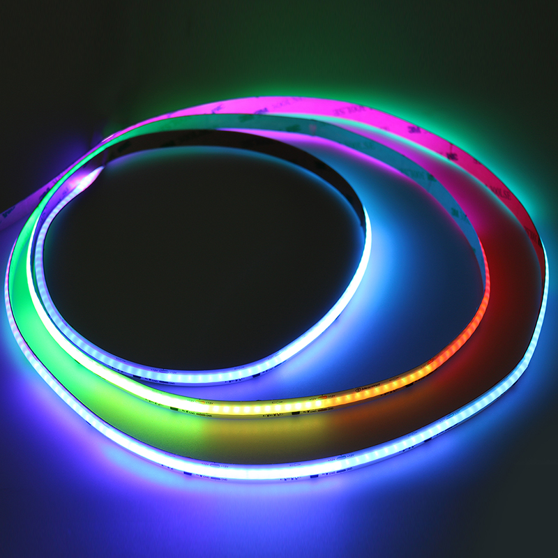 12V-COB-720LED RGB SPI是一款高密度、高亮度的LED灯带,采用COB(Chip on Board)技术,集成720颗RGB LED芯片,通过SPI(串行外设接口)协议控制,适用于需要高精度色彩和动态效果的照明场景。